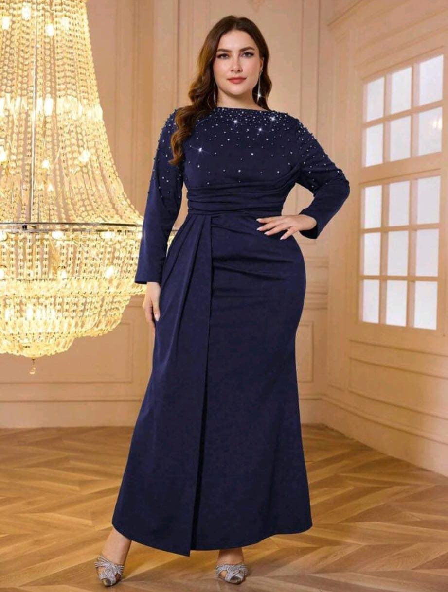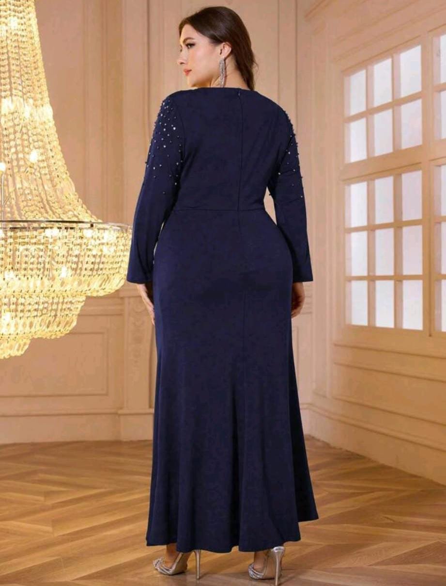 Questo elegante vestito lungo in blu notte è perfetto per chi desidera un look raffinato e femminile. Gli strass applicati sulla parte superiore donano un tocco di luminosità, mentre il taglio valorizza la silhouette con stile e armonia. Ideale per cerimonie, eventi formali o serate speciali.