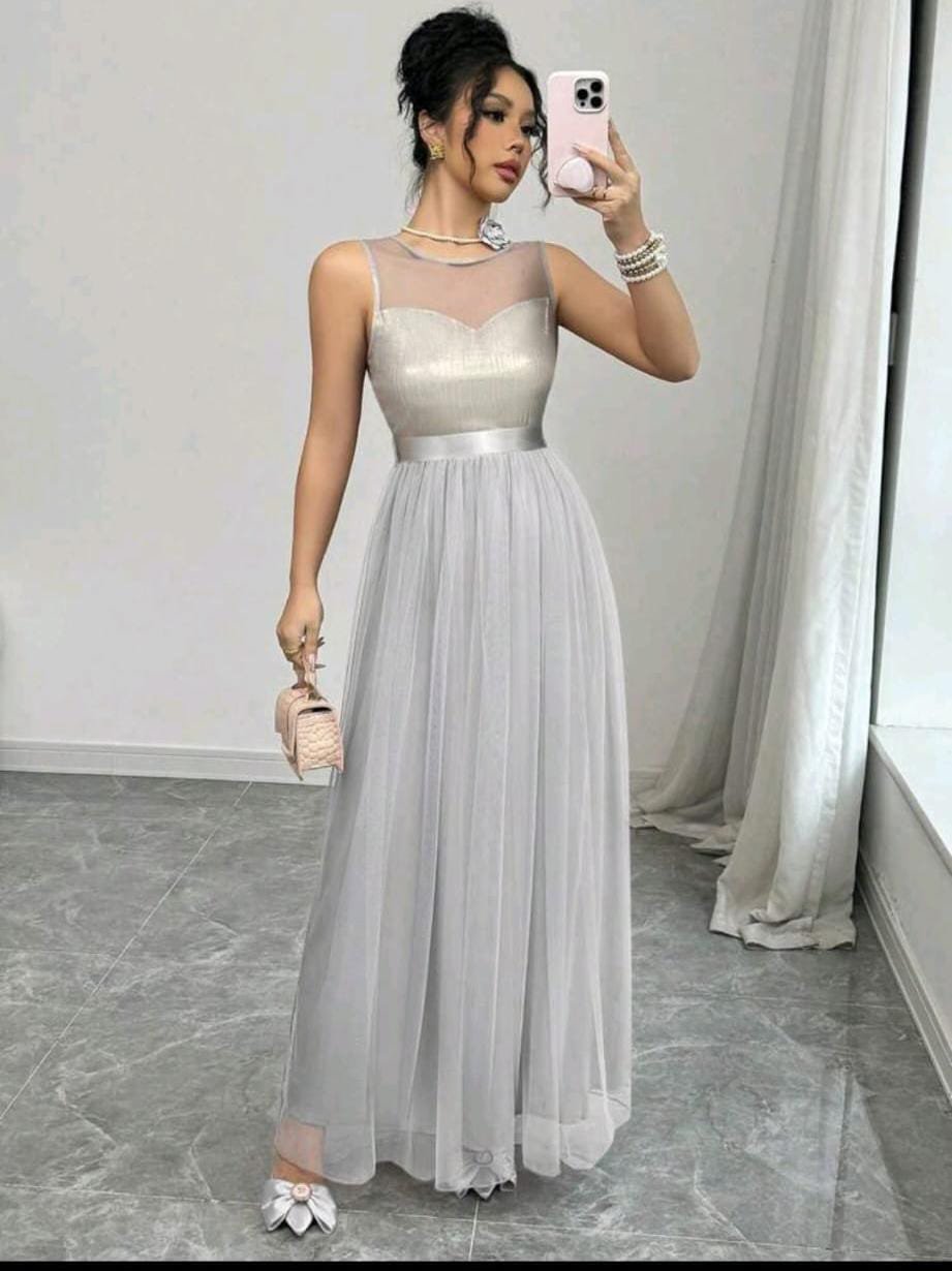 Elegante e sofisticato, questo vestito lungo grigio è perfetto per ogni evento speciale. Con un corpetto in tessuto lucido e una gonna fluida in tulle, offre un look raffinato e moderno. La cintura in raso in vita e il dettaglio in tulle trasparente sulla parte superiore aggiungono un tocco di classe, mentre la silhouette slanciata crea un effetto elegante e femminile. Un abito perfetto per matrimoni, serate galanti o eventi formali.